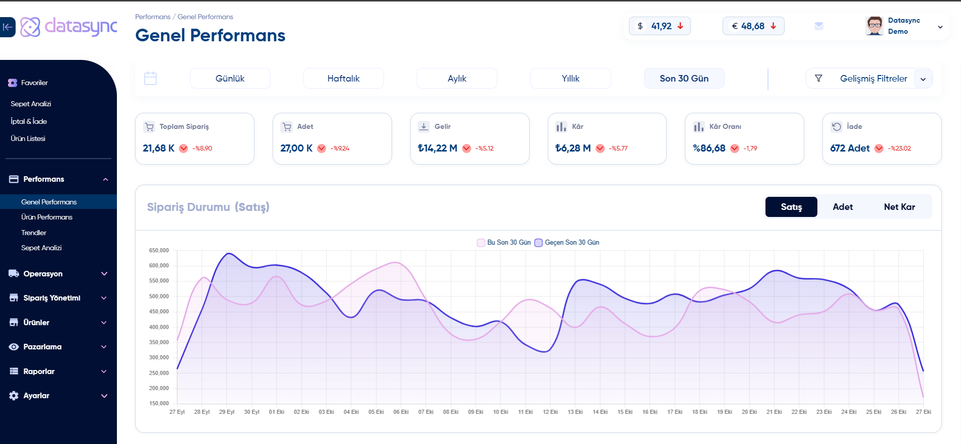 DataSync Genel Performans, e-ticaret markalarının tüm pazaryerlerindeki performans ve kârlılığını tek ekranda, anlık ve doğru şekilde gösteren bir analiz modülüdür.