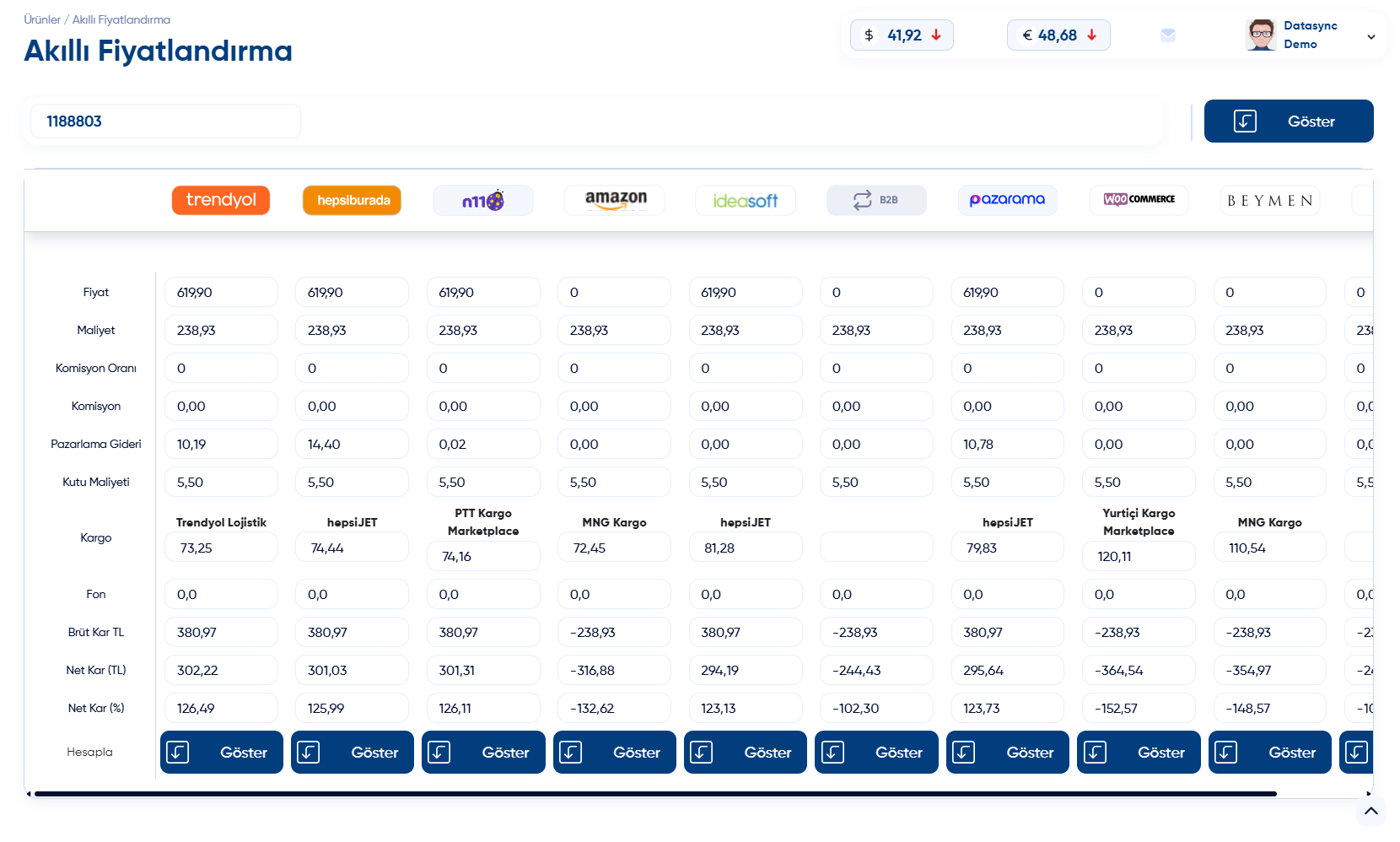 DataSync bu tarifeleri sisteminize yükledikten sonra, anlık olarak güncel oranlar üzerinden net kâr hesaplamaları yapar.